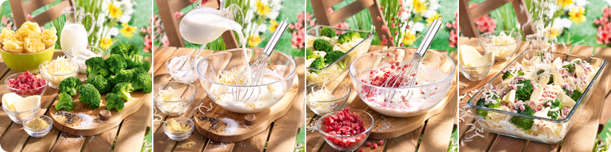 2. Nudeln in reichlich Salzwasser nach Packungsanweisung bissfest kochen. Broccoli für die letzten 2 Minuten dazugeben und mitkochen lassen.